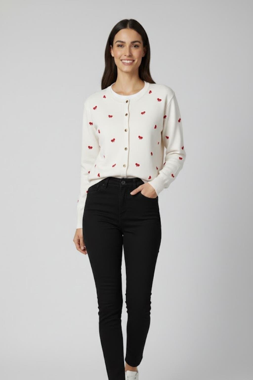 Kumaş: Yumuşak dokulu triko kumaş Detay: Kırmızı fiyonk desenli, altın rengi düğmeli ön kapama Kalıp: Rahat kesim Yaka: Bisiklet yaka Tarz: Günlük, klasik ve smart-casual Kombin Önerisi: Siyah pantolon veya eteklerle şık bir görünüm, açık renk jeanlerle ise daha günlük bir tarz elde edebilirsin. Sade görünümüne zarif bir dokunuş katmak isteyenler için tasarlanan siyah triko hırka, kırmızı fiyonk desenleriyle dikkat çekiyor. Yumuşak dokusu ve klasik kesimiyle hem günlük hem ofis tarzına uyum sağlar.