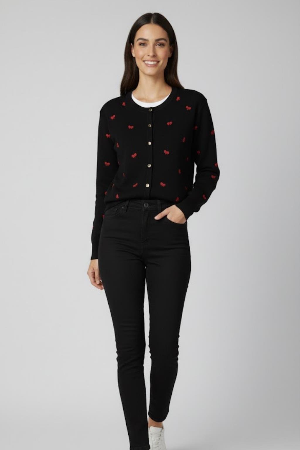 Kumaş: Yumuşak dokulu triko kumaş Detay: Kırmızı fiyonk desenli, altın rengi düğmeli ön kapama Kalıp: Rahat kesim Yaka: Bisiklet yaka Tarz: Günlük, klasik ve smart-casual Kombin Önerisi: Siyah pantolon veya eteklerle şık bir görünüm, açık renk jeanlerle ise daha günlük bir tarz elde edebilirsin. Sade görünümüne zarif bir dokunuş katmak isteyenler için tasarlanan siyah triko hırka, kırmızı fiyonk desenleriyle dikkat çekiyor. Yumuşak dokusu ve klasik kesimiyle hem günlük hem ofis tarzına uyum sağlar.