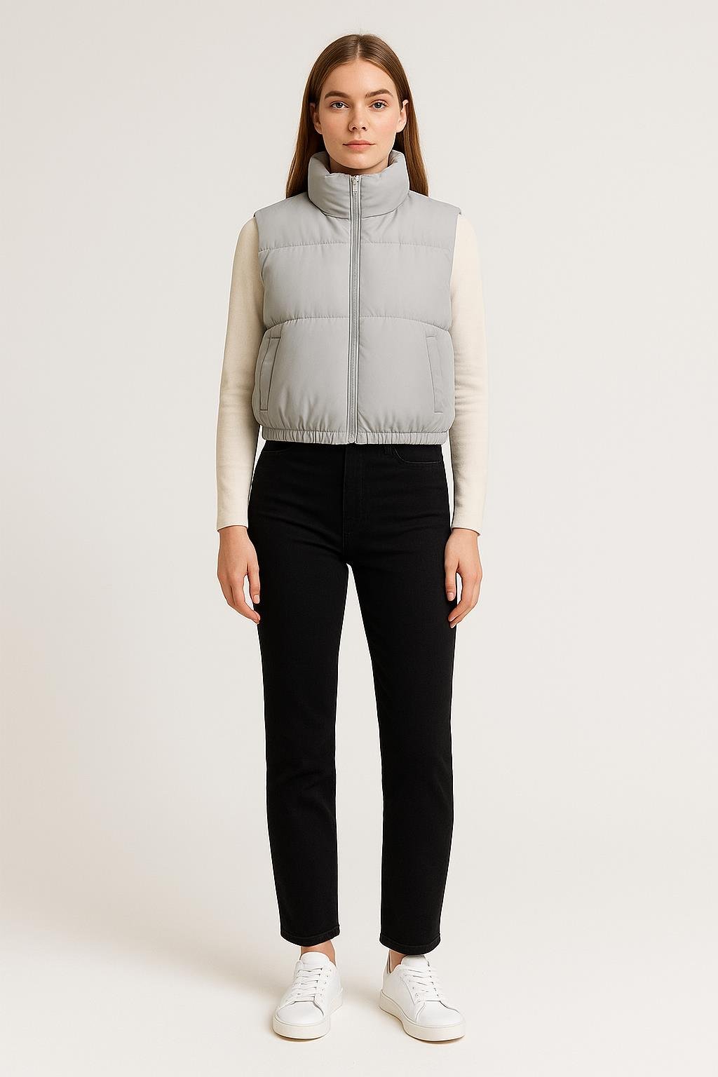 Kumaş: Suya dayanıklı dış kumaş Dolgu: Hafif elyaf dolgulu Yaka: Dik yaka Cep: Yan cepler Kapatma: Fermuarlı ön kapama Kalıp: Rahat ve standart kesim Tarz: Günlük, spor ve şehir stili Kombin Önerisi: Siyah pantolon ve beyaz sweatshirt ile sade ama modern bir görünüm oluşturabilir, spor ayakkabılarla tamamlayabilirsiniz. Spor ve şık tarzı bir araya getiren gri şişme yelek, hafif yapısı sayesinde maksimum konfor sunar. Soğuk havalarda kazak veya sweatshirtlerle rahatça kombinlenebilir.