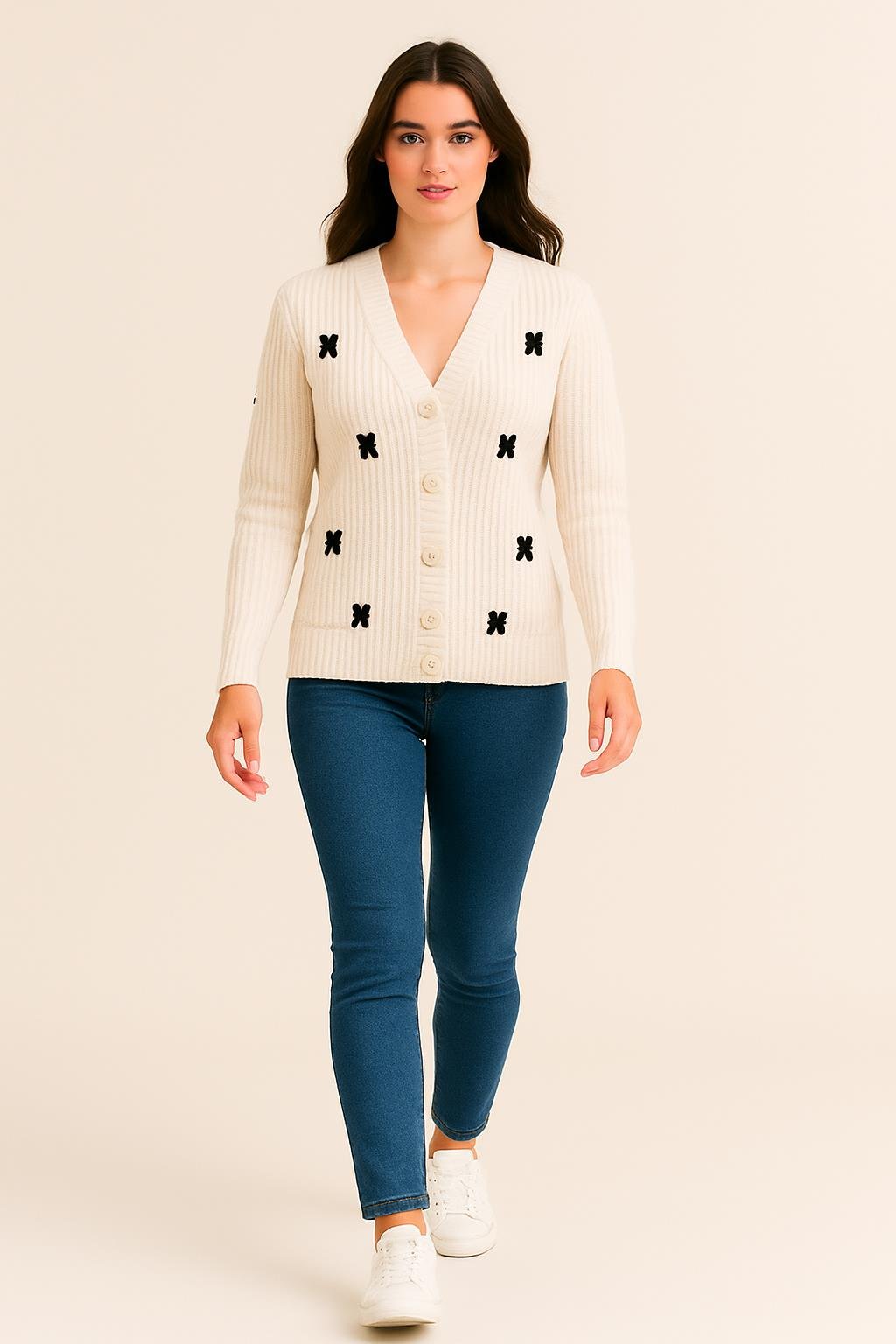Kumaş: Yumuşak triko dokuma Yaka: V yaka Kapatma: İncimsi düğme detaylı ön kapama Kalıp: Rahat kalıp Tarz: Günlük, romantik ve zarif kombinler için ideal Kombin Önerisi: Kot pantolon ve kısa topuklu ayakkabılarla sade bir şıklık yakalayabilir, eteklerle kombinleyerek daha feminen bir görünüm oluşturabilirsiniz. Yumuşak dokusu ve zarif fiyonk detaylarıyla dikkat çeken ekru triko hırka, hem şık hem de romantik bir stil sunar. Günlük kombinlerden özel buluşmalara kadar her ortamda konfor ve şıklığı bir arada yaşatır.