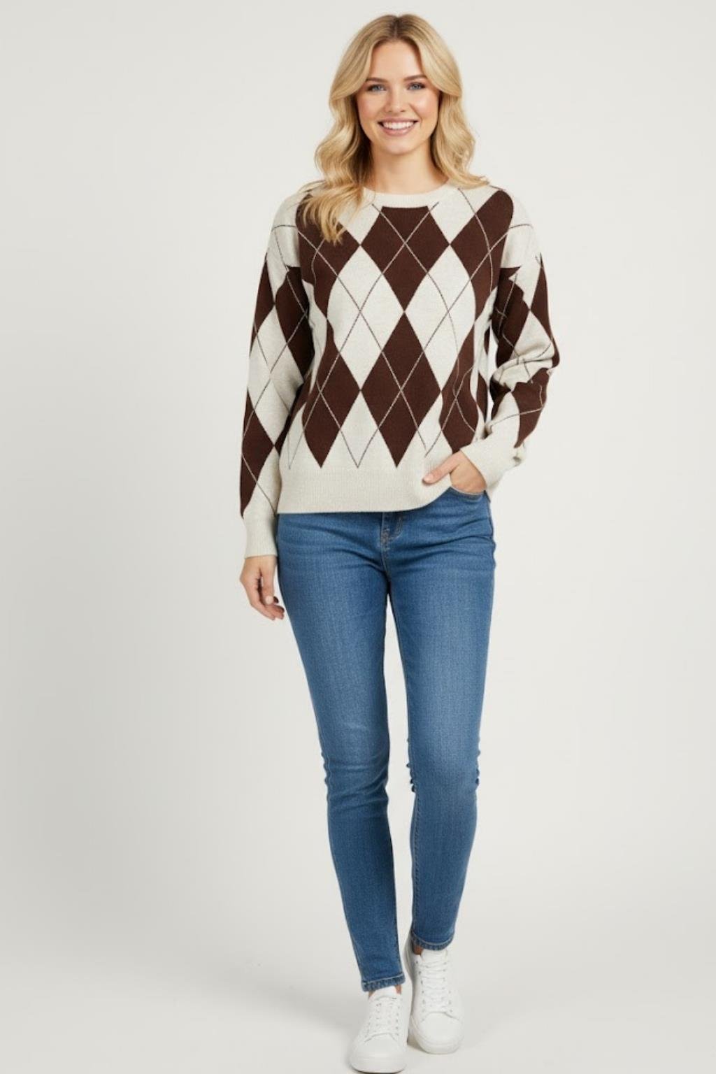 Kadın Baklava Desenli Triko Kazak MKP126 Kahve