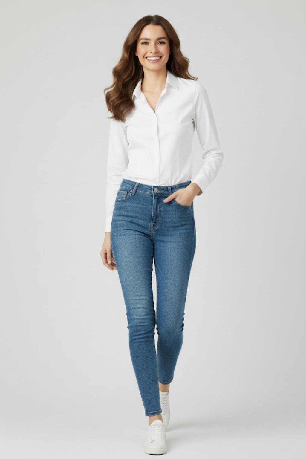 Kombin Önerisi: Skinny jean ve sneaker ile spor şıklık; kumaş pantolon ve topuklu ayakkabı ile ofis zarafeti Zarif ve sade tasarımıyla öne çıkan dar kesim beyaz gömlek, günlük kullanımda veya ofis stilinde şıklığı konforla buluşturur.