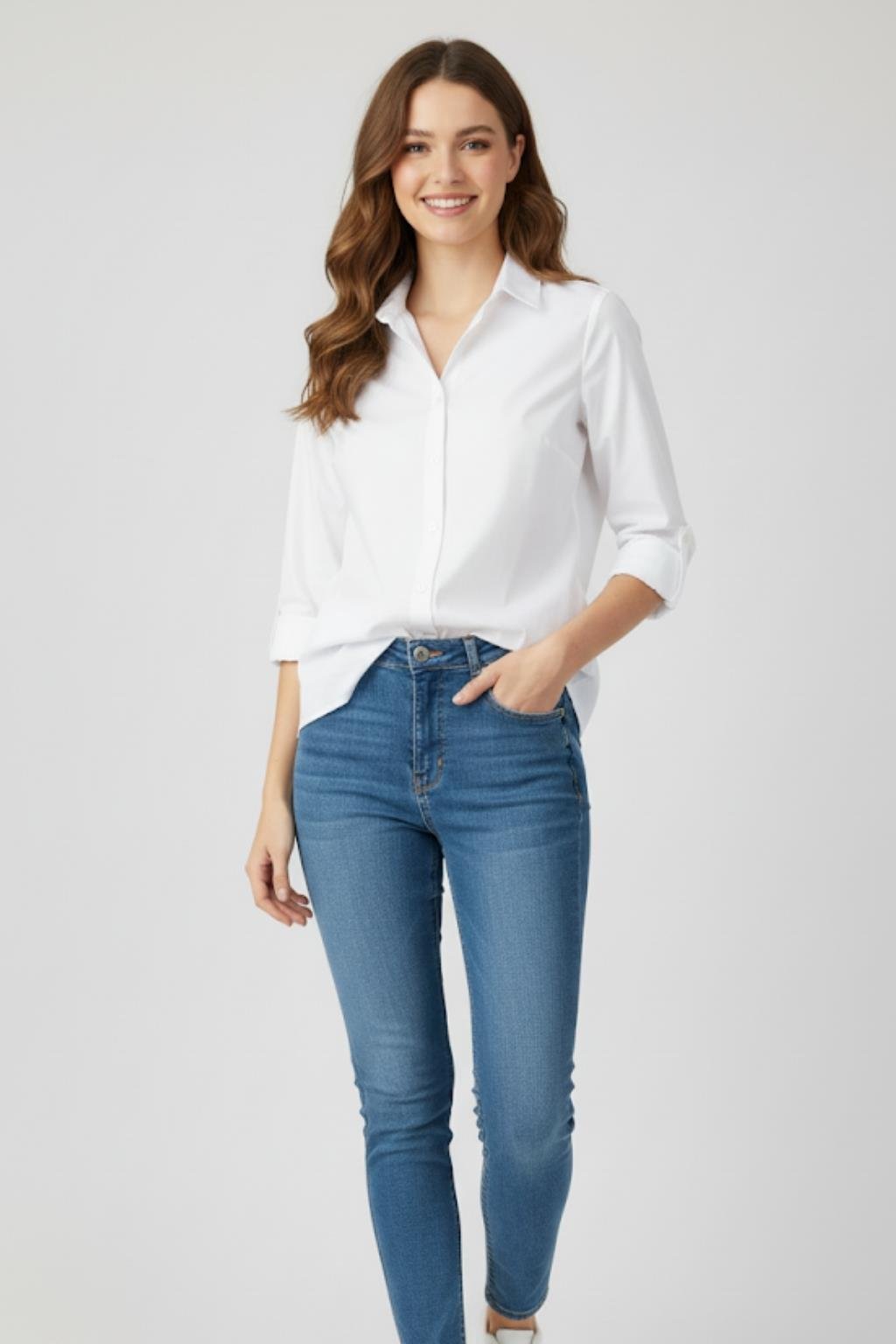 Renk: Beyaz Kumaş: Pamuk karışımlı, nefes alabilir kumaş Kalıp: Regular fit – rahat ve klasik kesim Yaka: Klasik yaka Kol: Uzun kollu, kıvrılabilir ve düğmeli manşet detayı Kapatma: Önden düğmeli Tarz: Günlük kullanım, ofis stili ve smart-casual kombinler için ideal Kombin: Jean, kumaş pantolon veya eteklerle kolayca kombinlenebilir Zarif ve sade tasarımıyla öne çıkan beyaz klasik gömlek, hem ofis şıklığı hem de günlük kullanım için mükemmel bir tercihtir.