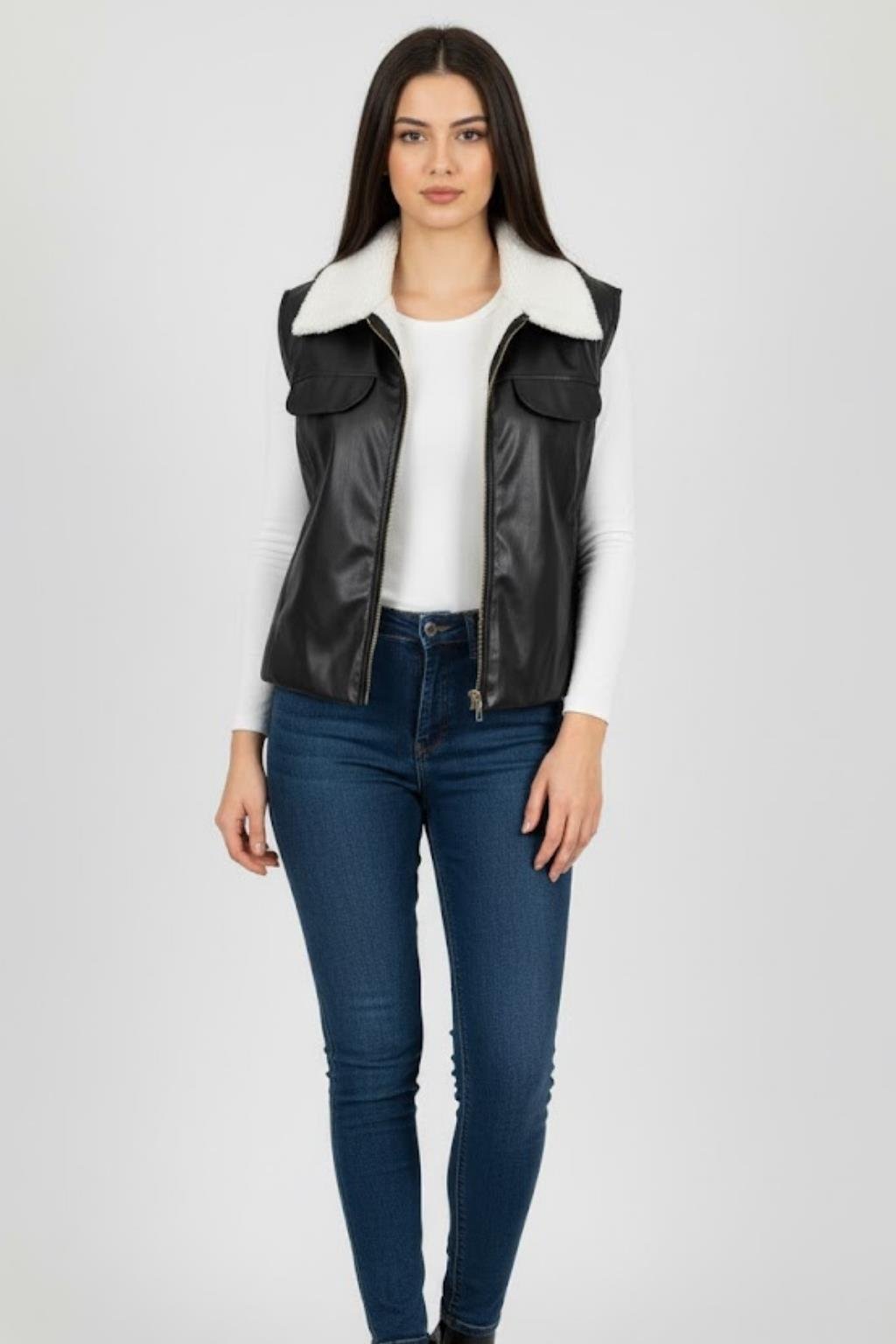 Kadın Siyah Deri Kürk Yaka Yelek M4866 Siyah