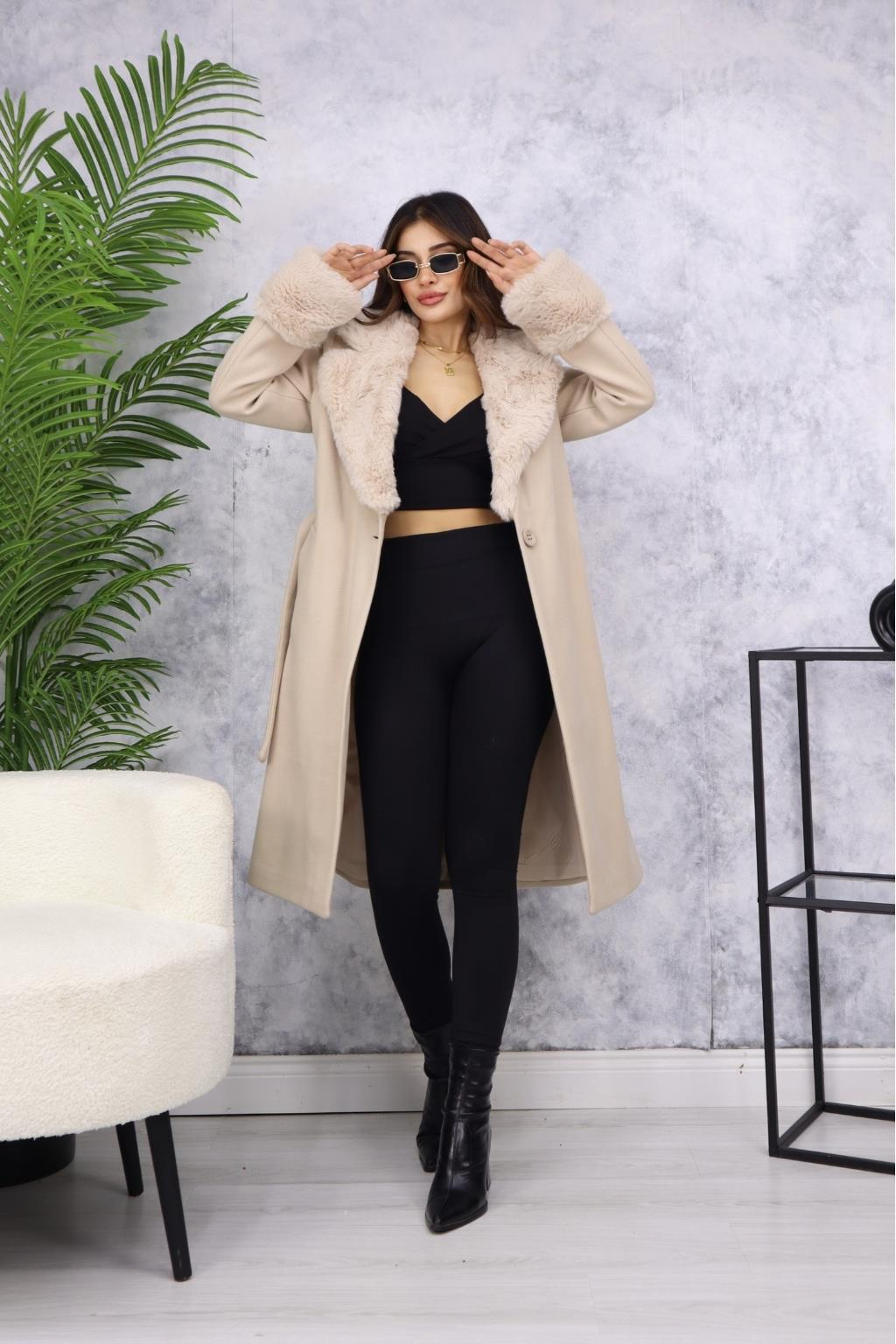 Kürk Detaylı Kemerli Montreal Kaban M3412 Bej