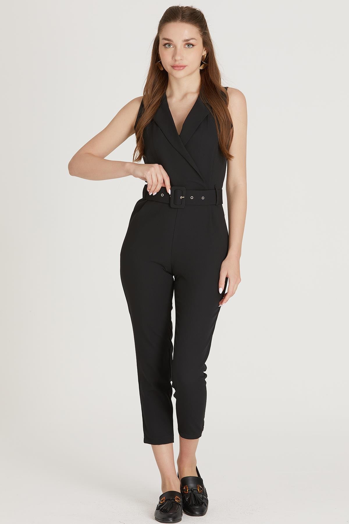 Kuşaklı Kolsuz Tulum M1733 Siyah