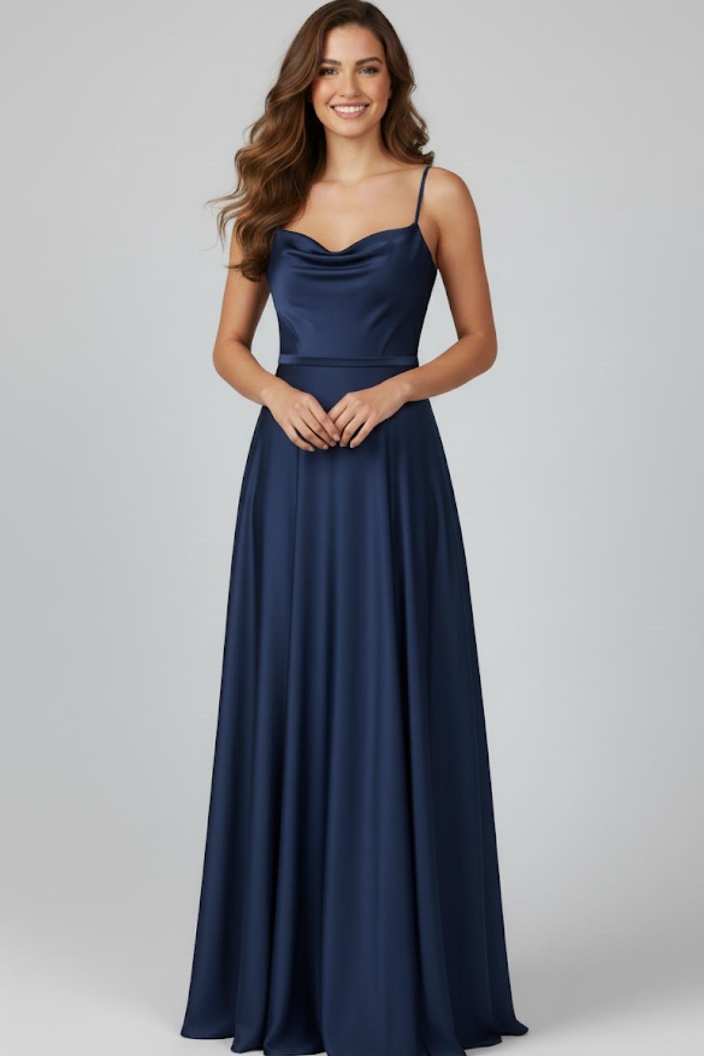 Kumaş: Saten, parlak ve akıcı dokulu Model: Uzun boy, A kesim Yaka: Dökümlü (drapeli) dekolte detaylı yaka Askı: İnce ve zarif omuz askıları Bel: Bel hattını vurgulayan kesim Arka Kısım: Rahat hareket sağlayan akıcı etek formu Kullanım Alanı: Davet, mezuniyet, düğün, özel geceler Tarz: Şık, zarif ve feminen görünüm Lacivert saten kumaşı ve şık tasarımıyla öne çıkan bu uzun abiye elbise, zarif davetler, düğünler ve özel geceler için mükemmel bir seçimdir.