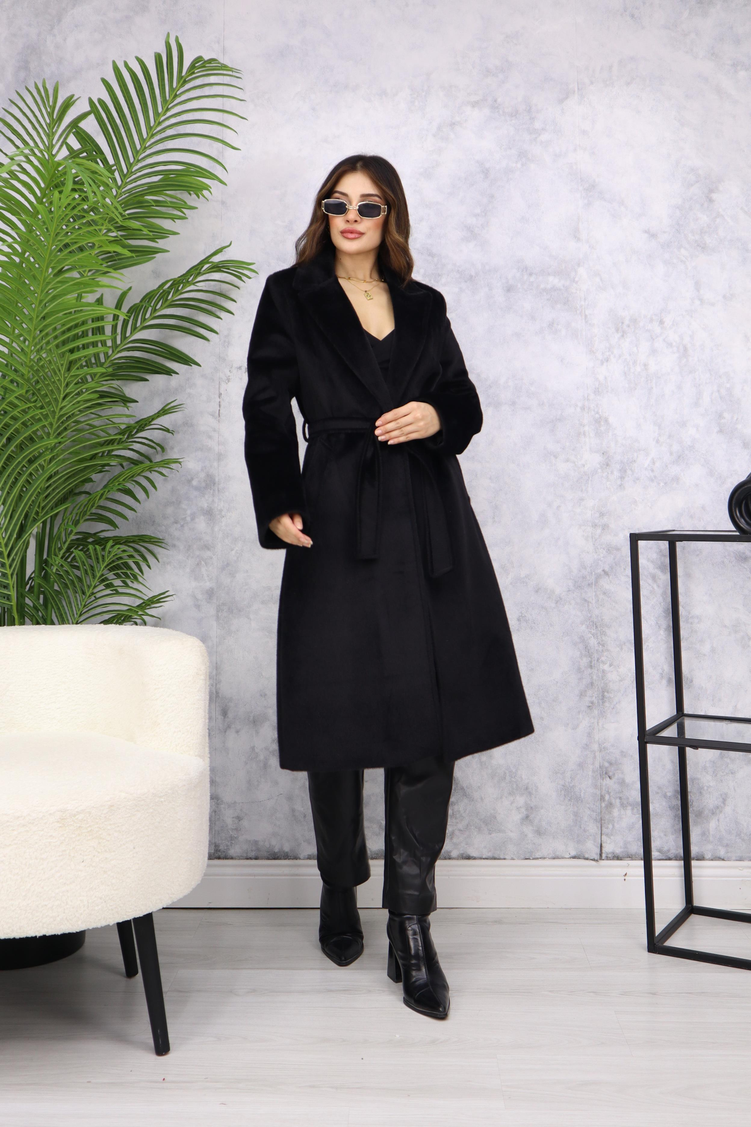 Tüylü Kuşaklı Kaşe Kaban M3403 Siyah