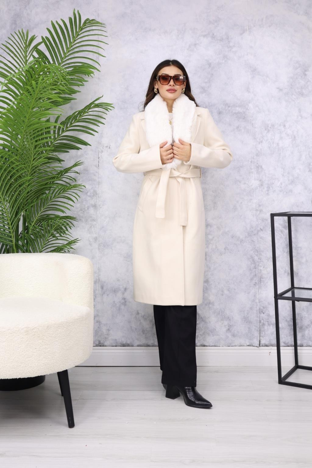 Yakası Kürklü Kuşaklı Kaban M3139 Bej